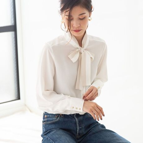 オンオフ問わず活躍してくれるクリーンな長袖ブラウスです。上品な配色が目を引くバイカラーのボウタイは、気分に合わせてアレンジを楽しむことが可能です。袖口に並んだメタルボタンがアクセントに。背中にタックを施して、シルエットには程よくゆとりを持たせました。ディテールにこだわりを感じさせる、魅力的なアイテムです。\n\n・透け感多少あり\n・ストレッチなし\n・カラー展開はホワイト×ラベンダー、オフホワイト×ライトベージュ、ブラウン×ベージュ、\n ラベンダー×ライトベージュ\n・サイズ展開は0(S)7号・1(M)9号・2(L)11号・3(2L)13号・4(3L)15号・5(4L)17号