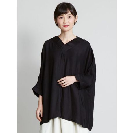 正面から見るとシンプルな印象の無地ですが、後ろは切り替えし部分に大胆な花柄を忍ばせています。歩くたびにチラリと見え隠れする花柄が粋。衿元は着物を着ているような重なったデザインでユニークな作りです。