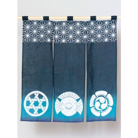 美しい朝焼けや夕焼けをおもわせる和色のグラデーションに、魔除けの意味を持つ紋様を並べた縁起の良いデザイン。やや短め丈の暖簾(のれん)。