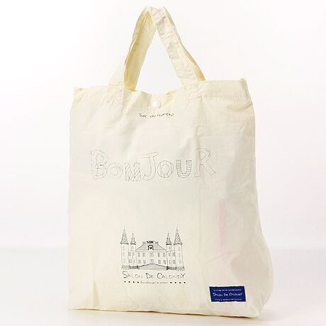 シンプルナカラーリングとBONJOURのロゴが入ったマルシェバッグ。【SALON DE CALONDY】からお買い物バッグの提案です。