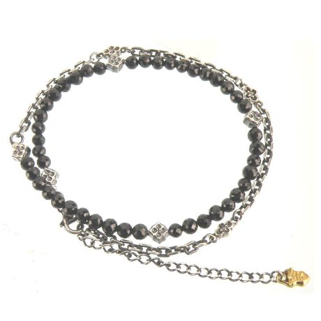漆黒の輝きを連ねたブラックスピネルと、艶やかなシルバーチェーンを二重に巻くブレスレット。微細なカットが光を細やかに反射し、手首の一振りで星屑のようなきらめきを放ちます。等間隔に配したトレサリーのシルバー飾りがリズムをつくり、品よくモードな表情に。エンドには18金メッキを施した〈シールドA〉のシルバーチップをあしらい、締めくくりまで抜かりない存在感を演出します。長さはアジャスターで自在に調整可能。単体で洗練、時計や他のバングルとの重ね付けでも抜群の相性です。仕立てはアトリエで一連ずつ丁寧に組み上げ、滑らかな着け心地と確かな耐久性を両立。日常から特別なシーンまで、装いに静かな高揚を添える一本です。