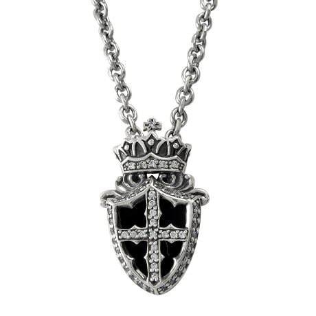 重厚さと洗練を兼ね備えた〈クラウンシールド・ペンダント〉。王冠を戴いた盾をベースに、中央には荘厳なクロスを描き出すデザイン。盾には漆黒の天然オニキスをセッティングし、その深い光沢がモダンな気配を漂わせます。クロス部分には透明感あるCZクリアをパヴェ状に敷き詰め、白と黒の鮮烈なコントラストを演出。気品と存在感が同居するその造形は、胸元に確かな印象を残します。背面にはブランドロゴと〈925〉の刻印を施し、真のクオリティを保証。ディテールの一つひとつは信頼するアトリエで熟練の職人が丹念に仕立て上げたもの。シルバーの艶やかな質感とオニキスの深淵な黒が響き合い、アクセサリーの枠を超えた現代的なアートピースとして完成されています。身に着けることでスタイルを格上げし、日常にラグジュアリーな余韻を添える一品です。
