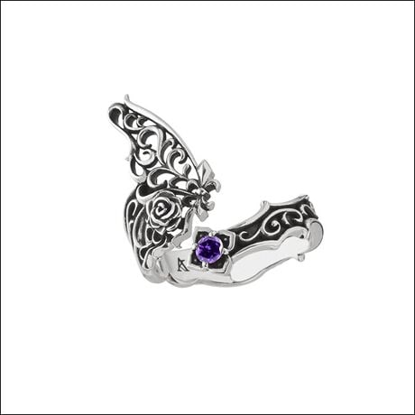 透かし模様で描かれた翼は、軽やかでありながらも力強い存在感を放ち、その中に薔薇とユリをあしらうことで象徴的な美の物語を紡ぎ出しています。流れるようなアームのラインは、まるで蝶が舞い描く軌跡のように優雅で、指先に動きと余韻を添えます。エンド部分にはパープルジルコニアをセットしたトレサリークロスが輝き、妖艶な光彩で全体を引き締め、神秘的な魅力を際立たせます。シルバー925を素材に、アトリエで熟練のクラフトマンが一つひとつ丹念に成形と研磨を施すことで、細部に至るまで完成度の高さを追求。鏡面仕上げの艶と燻しによる陰影が調和し、ジュエリーを超えたモダンアートのような存在感を実現しました。