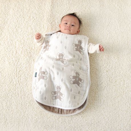 ディモワのSOULEIADO 6重ガーゼスリーパー モンヌヌース ブラウン掛け布団をはねてしまっても、スリーパーを着ていれば風邪をひきません。吸収性、発散性に優れた6重ガーゼを使用しているので夏は汗を素早く吸収し、冬は暖かな空気を逃がしません。洗えば洗うほどふんわりやわらかくなるのもうれしいですね。かわいらしいくまのデザインは男の子、女の子、どちらでも使って頂けます。[型番:4343]ディモワ/10mois/ソレイアード/SOULEIADO/ベビーギフト