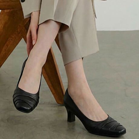 上品な光沢を持つブラックのアッパーに、つま先部分のクロスギャザーデザインがエレガントなアクセントを添えるパンプスです。安定感のある程よい高さの太ヒール(チャンキーヒール)を採用することで、美脚効果と歩きやすさの両立を実現しました。甲部分を美しく見せるすっきりとしたスクエアトゥは、指先への圧迫感を軽減し、長時間履いても疲れにくい快適な履き心地をサポートします。通勤・オフィススタイルから、リクルート、卒業式・入学式などのフォーマルなシーンまで幅広く活躍する、一足持っていると安心なベーシックアイテムです。
