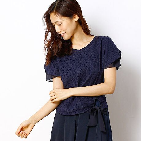 着心地の良いレースブラウス。フロントは二重になっており、肌に当たる部分は綿素材のカットソーなので1枚でも透けにくく快適に着て頂けます。お袖は二の腕が隠れる丈で、綿レースが可愛らしく1枚で主役になれるトップスとなっております。
