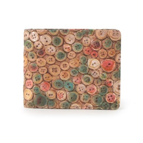 一見シンプルな二つ折り財布ですが、開けると札入れが二股に分かれ、カード入れの部分が隠れるように作られています。また、小銭入れが広く開き、取り出しやすくなっています。カードは全部で6段で、それぞれの下がポケットになっています。 本物のボタンが埋めこまれたように見えますが、こちらは牛革に型押しをした素材です。