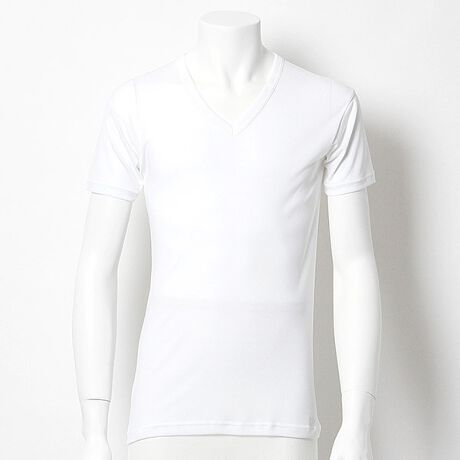 冷感速乾素材(クールメイク)を使用した接触冷感脇パット付きのVネックTシャツ。衣服内のムレ感を拡散し緩和。汗などニオイを消臭するデオドラントインナー (部屋干し対応)