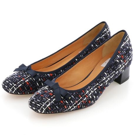 トップラインとリボンに使われたグログランがアクセントになったスクエアトゥパンプス。クセのないシンプルなフォルムはコーディネートを選ばすに活躍してくれそうな一足です。