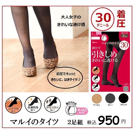 マルイのタイツ(MARUI TIGHTS)の【着圧30デニール】【おなかゆったりJM〜Lサイズ】2足組「マルイのタイツ」。