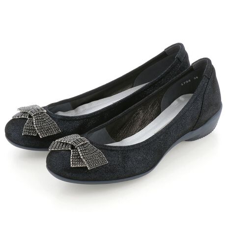 キラキラと光沢のあるリボンモチーフがキュートなコンフォートパンプス。
