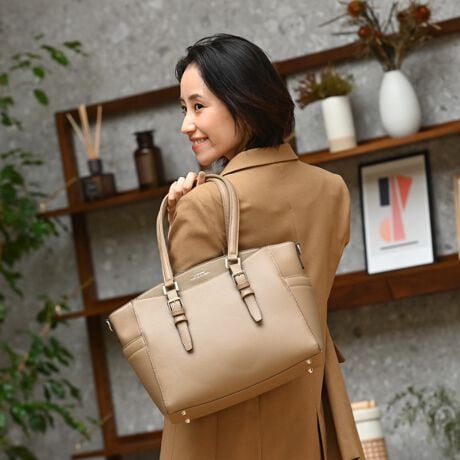 「バイカラー」ですが、ワントーンでまとまっている感じです。各パーツの縁がブラウンのパイピングのようになっていて、シンプルすぎず、年代を問わずに持てると思います。