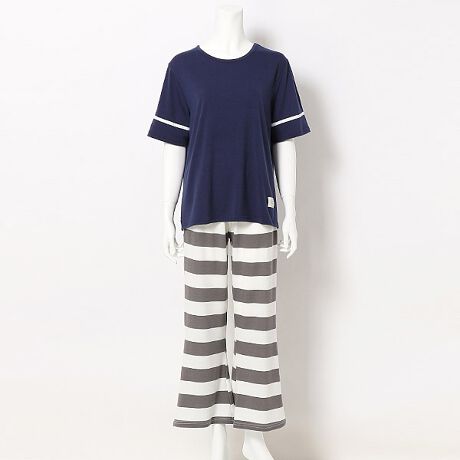 ベーシックな色柄ですっきりしたルームウエア上下セット。上着の袖口のパイピングと裾にあるタグがアクセント。ちょっとした外着としても着られて、便利な1着。